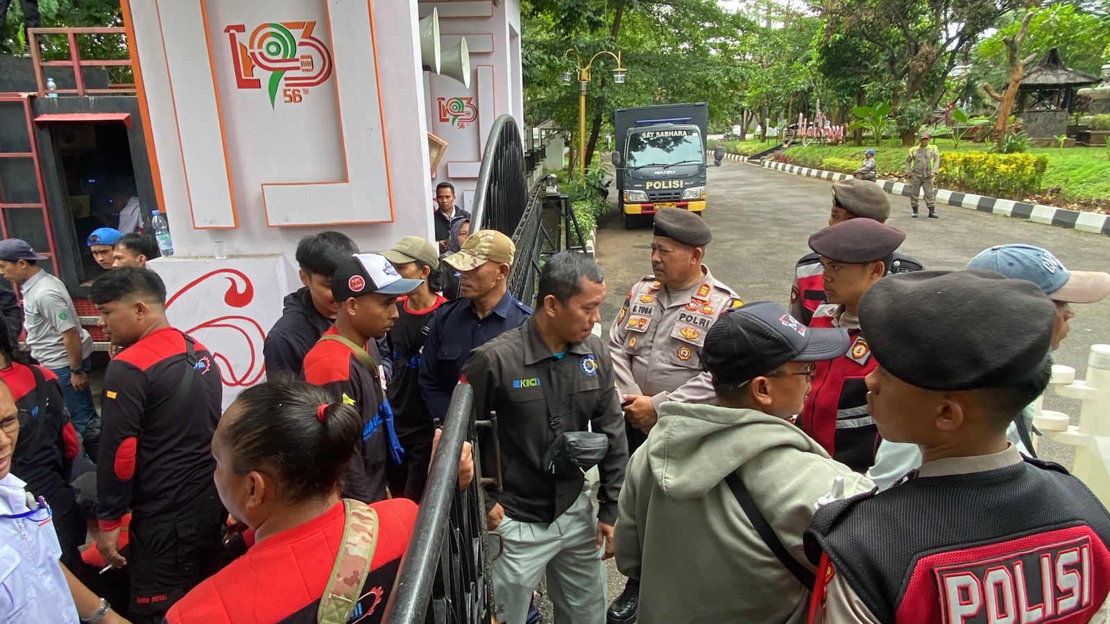 PURWAKARTA – Personil Polres Purwakarta diterjunkan dalam pengamanan aksi ratusan buru dari SP FSPMI Kabupaten Purwakarta di Kantor DPRD Kabupaten Purwakarta, pada Senin, 23 Desember 2024.