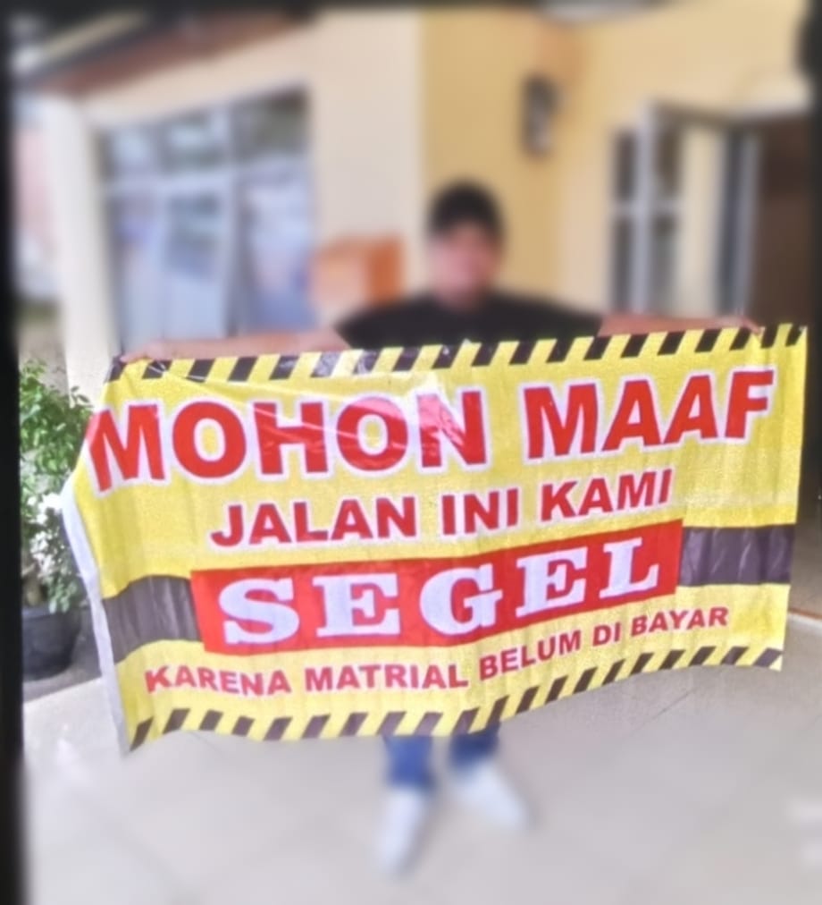 Di tengah polemik yang memanas, publik dikejutkan dengan beredarnya foto sang pemborong yang tengah membentangkan sebuah baliho bertuliskan, “Mohon maaf jalan ini kami segel karena material belum dibayar.” Foto tersebut langsung memicu spekulasi dan tanda tanya besar tentang apa yang sebenarnya terjadi di balik mandeknya proyek hotmix tersebut.