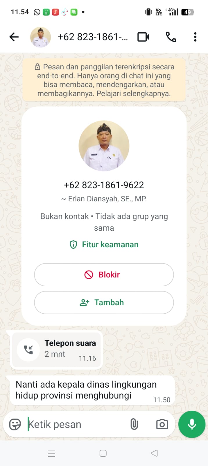 Pelaku menggunakan nomor 082318619622, dan memasang foto profil serta mencatut nama Erlan Diansyah, SE,MP.