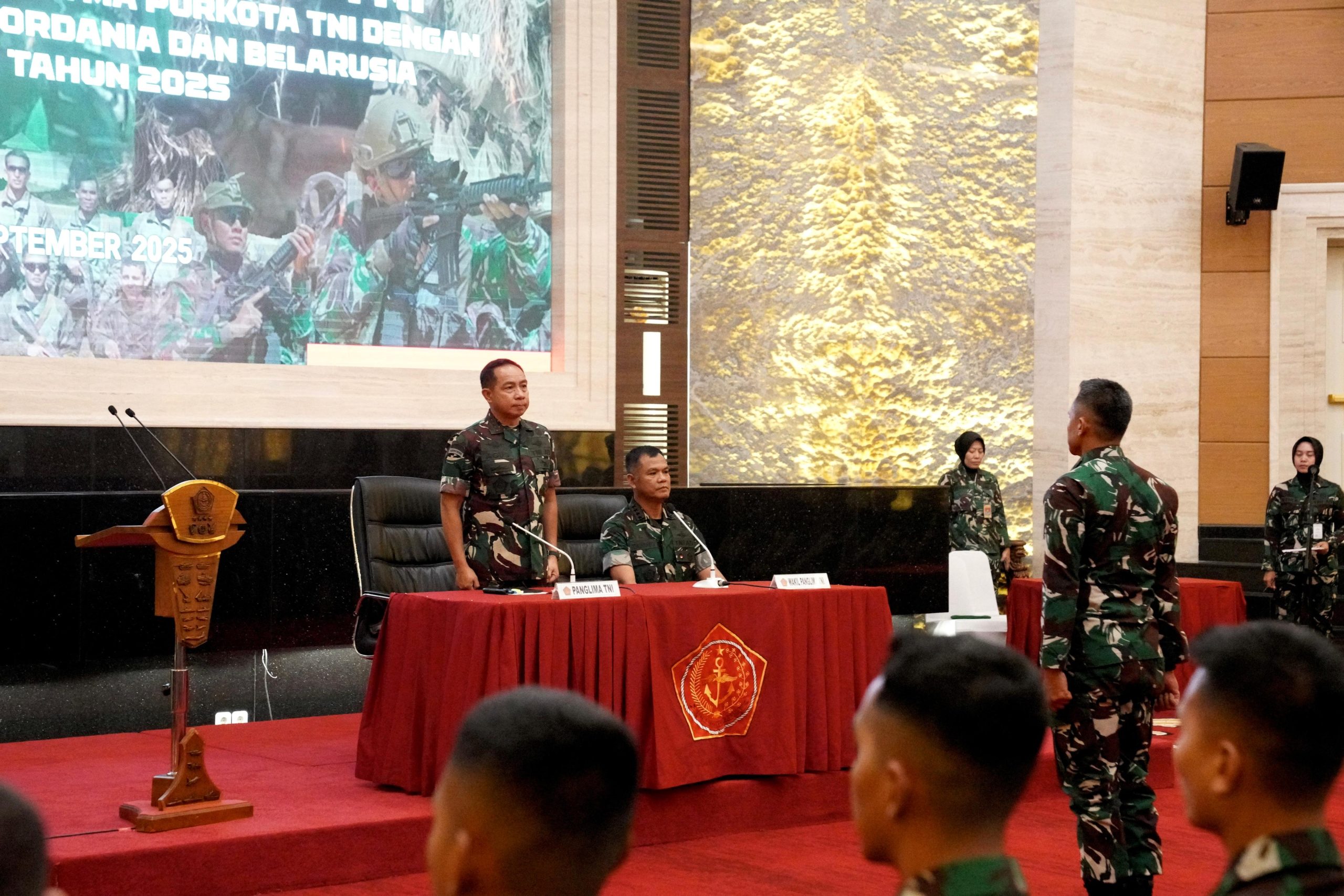 PIJARNUSA.COM-Panglima TNI Jenderal TNI Agus Subiyanto memberikan pengarahan kepada personel purna tugas kontingen Latihan Bersama (Latma) Pertempuran Kota (Purkota) TNI gelombang I yang baru saja menyelesaikan latihan bersama Angkatan Bersenjata Yordania dan Belarusia, bertempat di Aula Gatot Soebroto, Mabes TNI, Cilangkap. Jakarta Timur. Senin (8/9/2025).