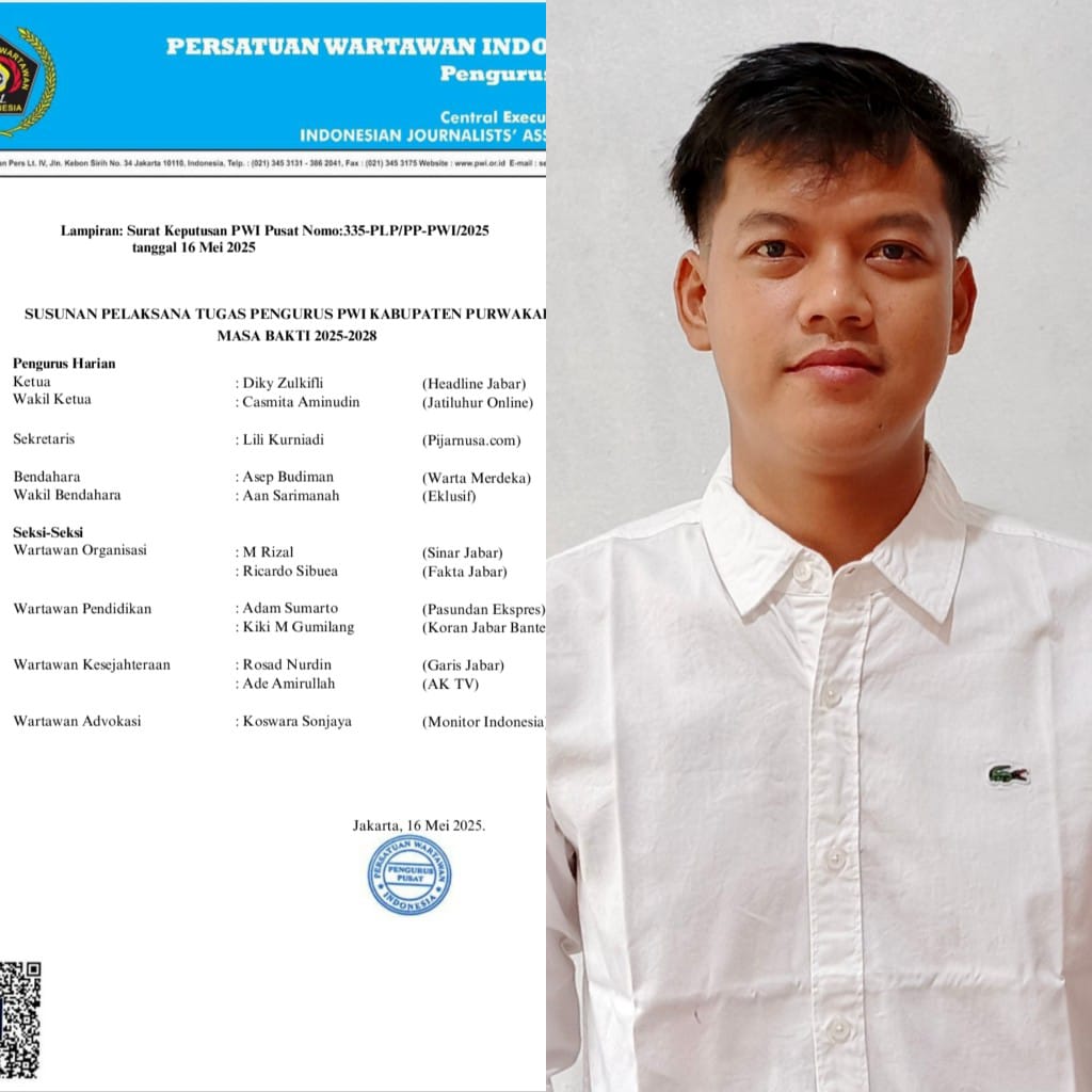 Pijarnusa.com, Purwakarta – Persatuan Wartawan Indonesia (PWI) Pusat resmi menunjuk Diky Zulkifli sebagai Pelaksana Tugas (Plt) Pengurus PWI Kabupaten Purwakarta untuk periode 2025-2028.