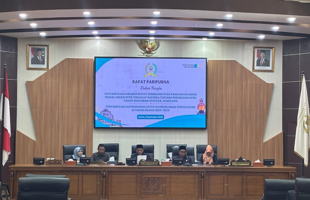 PIJARNUSA.COM, Sumedang-Dewan Perwakilan Rakyat Daerah (DPRD) Kabupaten Sumedang menggelar rapat paripurna di Ruang Rapat Paripurna DPRD pada Kamis (4/9/2025). Agenda rapat kali ini membahas penyampaian jawaban Bupati atas pandangan umum fraksi-fraksi terkait Raperda tentang APBD Perubahan Tahun Anggaran 2025 serta penyampaian laporan hasil reses masa persidangan III tahun sidang 2024–2025.