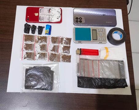 “Saat dilakukan penggeledahan, anggota kami menemukan sebuah kantong plastik warna hitam yang didalamnya terdapat 5 bungkus plastik klip bening kosong bekas kemasan tembakau sintetis, sebuah timbangan digital warna silver, 4 lembar kertas pahpir rokok, sebuah isolasi warna hitam bekas pakai, sebuah korek api gas warna merah dan sebuah handphone merk realme warna ungu milik MRM,” Jelas Yudi.