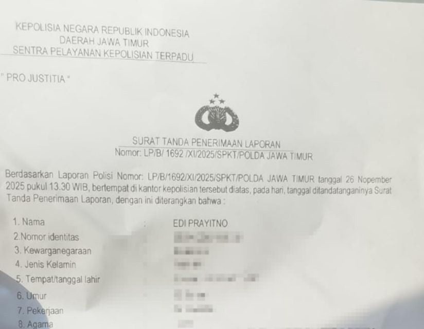 PIJARNUSA.COM – Seorang jurnalis profesional, Edi Prayitno, resmi melaporkan dugaan pengancaman melalui media elektronik serta penyebaran sebuah video bermuatan intimidasi ke Polda Jawa Timur pada Selasa, 26 November 2025. Laporan tersebut tercatat dengan nomor LP/B/1692/XI/2025/SPKT/POLDA JAWA TIMUR.